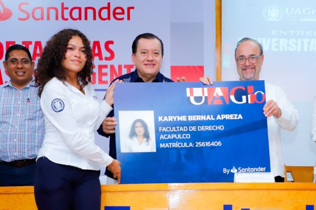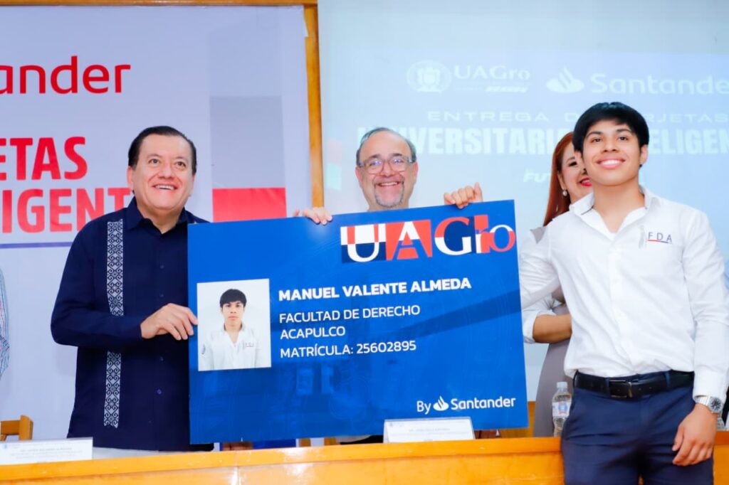 Acapulco, Gro., 2 de diciembre de 2025.- El rector de la Universidad Autónoma de Guerrero (UAGro), Javier Saldaña Almazán, y el director adjunto de Santander Universidades México, Jaime Valls Esponda, entregaron en la Facultad de Derecho de Acapulco 7 mil nuevas tarjetas universitarias inteligentes que permitirán a los estudiantes abrir su primera cuenta bancaria, agilizar el pago de servicios sin hacer filas y acceder a diversos beneficios académicos.